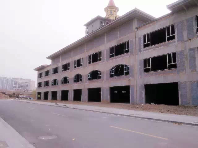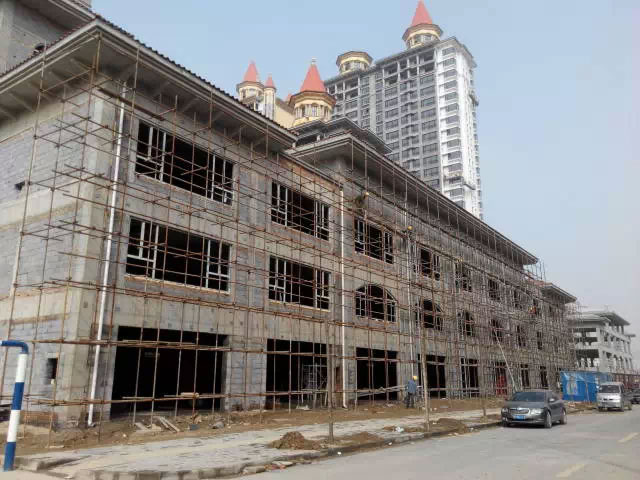 工人師傅正在緊鑼密鼓的進(jìn)行外墻石材干掛,2015年6月底全面交工